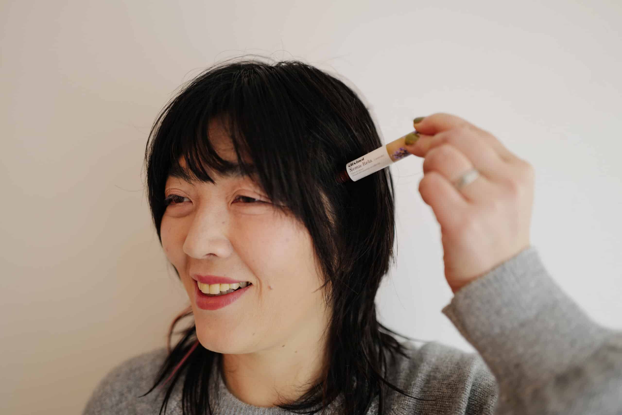 そして、疲れを感じた時は、自分なりの方法でリラックスも心掛けてください。私も、香りがお気に入りの『エリクシノール ボタニカルCBDフレグランス ネムリララベンダー』のロールオンで頭皮をマッサージしています。手首などにつけることもあるのですが、肌になじむのが早くていい香りなので、とてもリラックスできます。